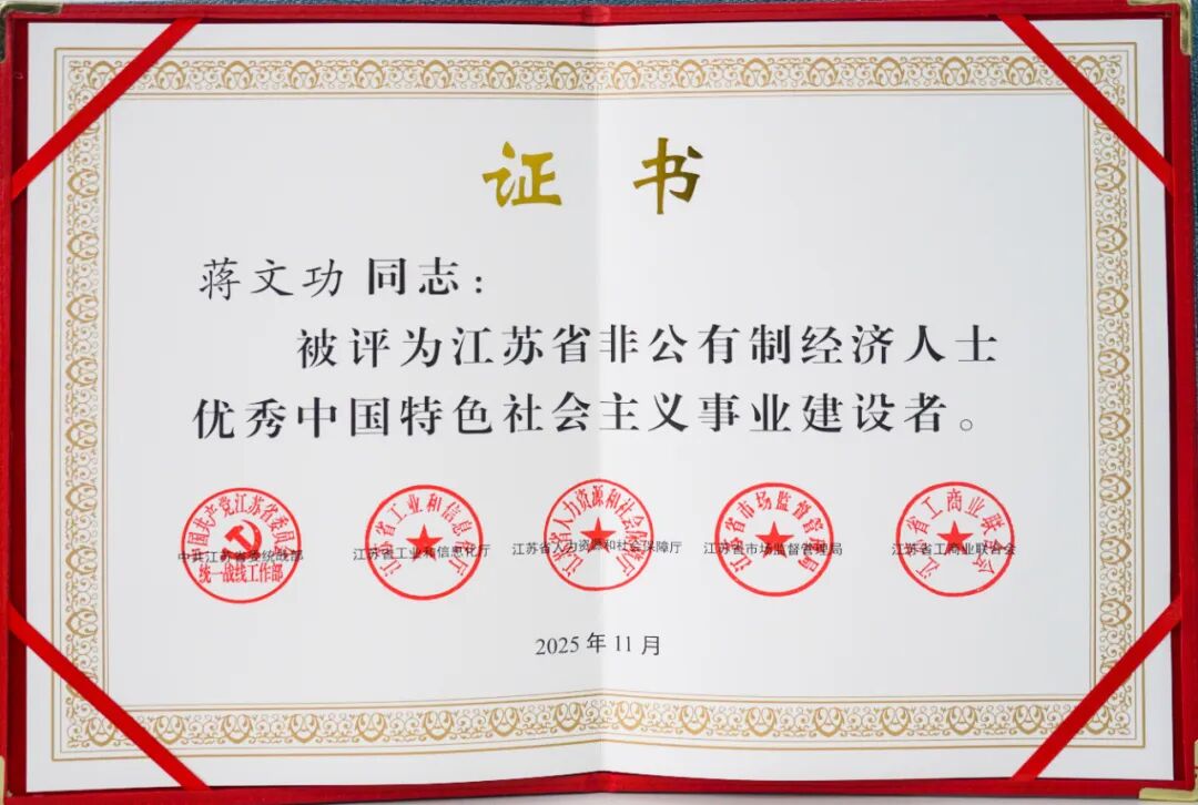 喜讯!威腾电气集团股份有限公司董事长蒋文功荣获第八届“江苏省非公有制经济人士优秀中国特色社会主义事业建设者”称号!